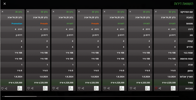 עמוד השוואה ניתן ללקט דירות מפרויקטים שונים ולערוך השוואה בעמוד אחד